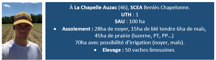 Je suis Quentin Rayjal, je suis installée depuis quasiment 1an et demi sur l’exploitation familiale dans le département du Lot. L’atelier principal de l’exploitation est la production de noix. J’élève également une cinquantaine de vaches limousines.