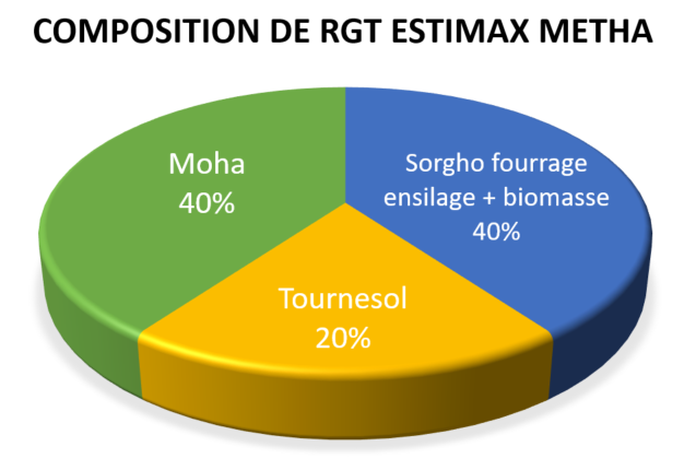 Depuis plusieurs années, RAGT développe des solutions de mélange CIVE d’été destinées à la méthanisation. Ces mélanges sont composées d’espèces aptes à se développer avec des températures élevées, le sorgho, le tournesol et le moha. Le sorgho et le tournesol oléique assure à maturité le pouvoir méthanogène et le moha permet de couvrir le sol et réduire le développement des adventices.