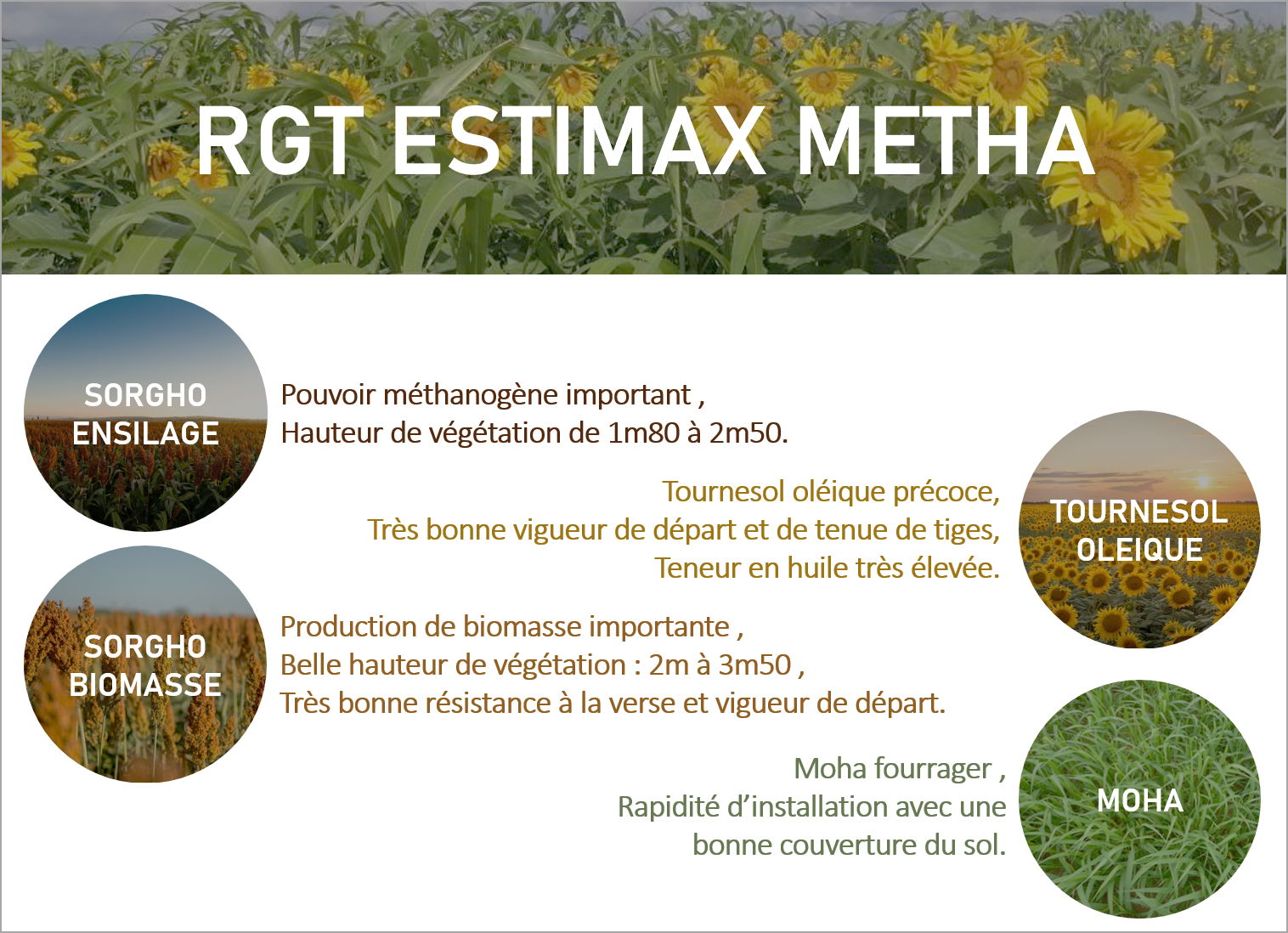 RAGT développe des solutions de mélange CIVE d’été destinés à la méthanisation. Ces mélanges sont composés d’espèces aptes à se développer avec des températures élevées, le sorgho, le tournesol et le moha. Le sorgho et le tournesol assure à maturité le pouvoir méthanogène, le moha permet de couvrir le sol et de réduire le développement des adventices.